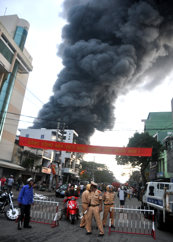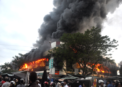 Đến 8h sáng nay, ngọn lửa vẫn bùng cháy dữ dội. Hàng trăm tiểu thương ở những kiot xung quanh chợ hoảng loạn di dời hàng hóa, đồ đạc vì sợ lửa cháy lan.